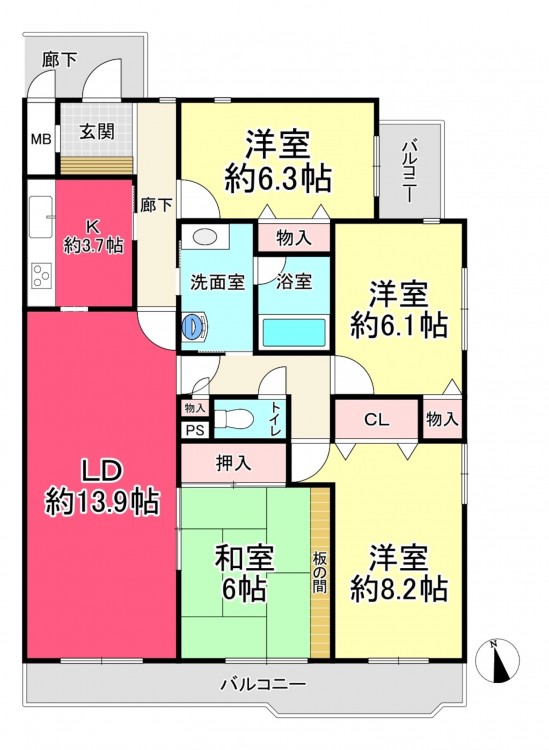 南東角部屋で5階につき眺望良好!専有面積99.50㎡で全居室6帖以上のゆったりした間取りです。